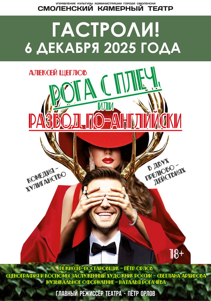 Чем завершилось столь хитроумно задуманное предприятие, удалось ли доверенному лицу Батлера поколебать устои семейного благополучия босса и кому в конце концов достался Роллс-Ройс, зритель узнает из новой комедии Смоленского камерного театра «Рога с плеч, или Развод по-английски».