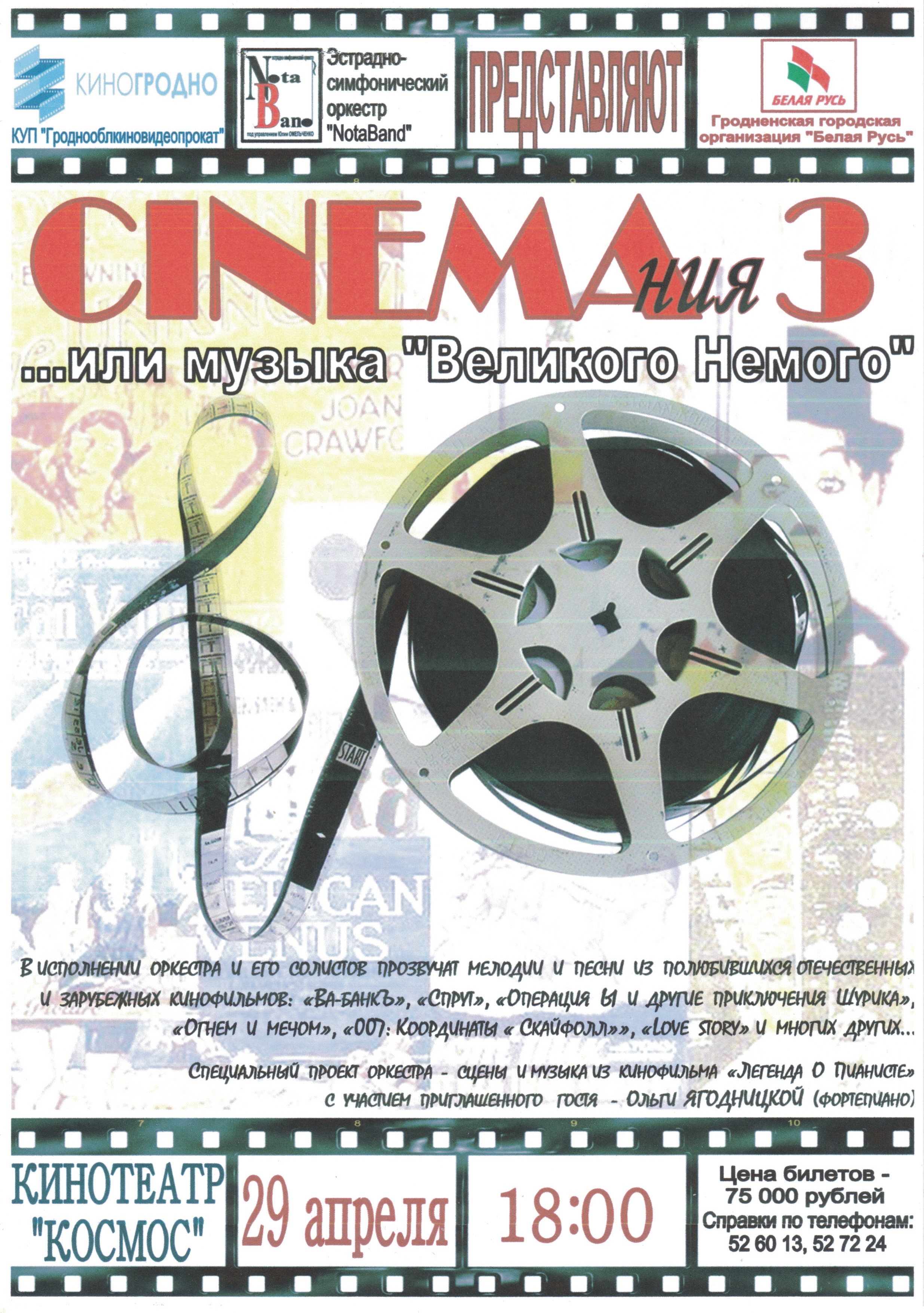 В исполении оркестра и его солистов прозвучат мелодии и песни из полюбившихся отечественных и зарубежных кинофильмов: "Ва-Банкъ", "Спрут", "Операция Ы и другие приключения Шурика", "Огнем и мечом", "007: Координаты "Скайфол", "Love story" и многих других ...