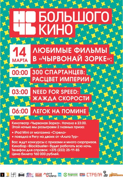 14 марта 2014 года в кинотеатре "Чырвоная Зорка" пройдет "Ночь большого кино", будут показаны фильмы: