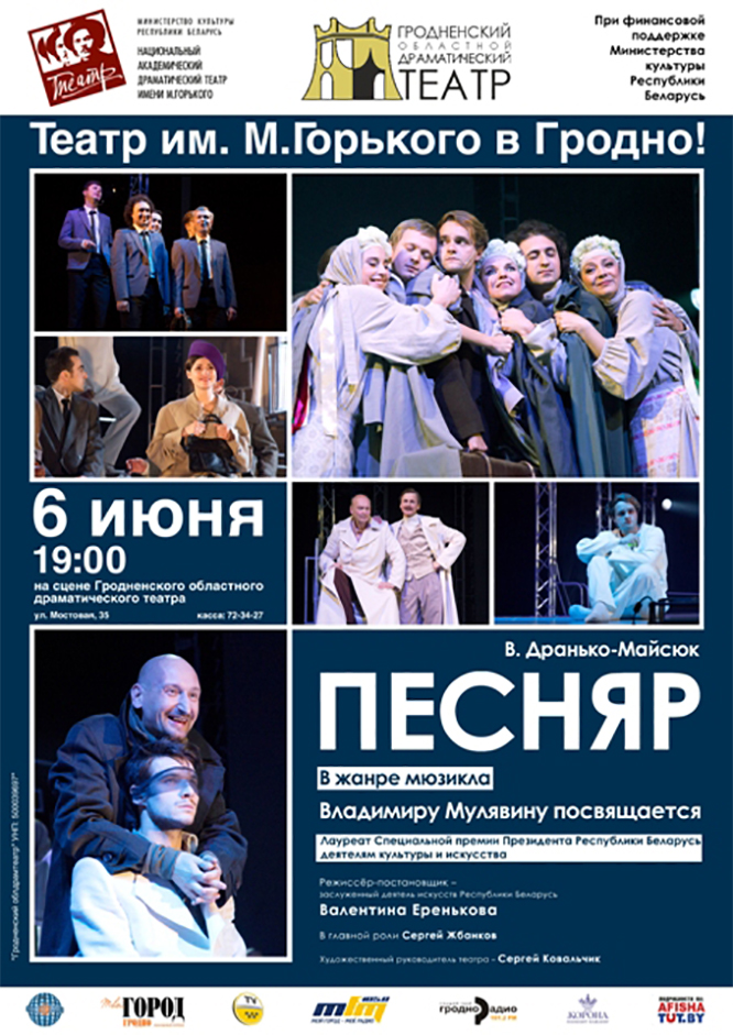 Национальный академический драматический театр им. М. Горького, г.Минск. Основателю и бессменному руководителю ансамбля «Песняры» Владимиру Мулявину посвящается. Лауреат Специальной премии Президента Республики Беларусь деятелям культуры и искусства (2016 г.). Спектакль «Песняр» – уникальное событие в театральной жизни Беларуси!