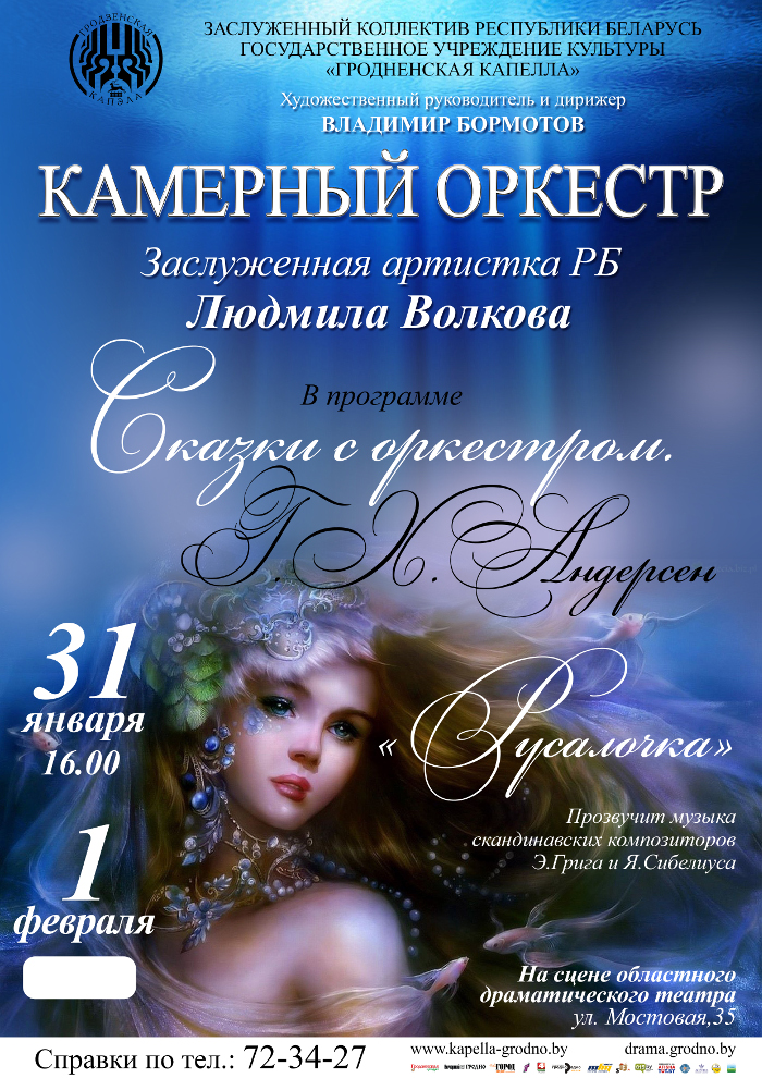 Цикл концертных программ, в которых известные актеры театра, кино вместе с симфоническим оркестром исполняют известные сказки. Красочное звучание симфонического оркестра и голос актера создают неповторимое прочтение популярных шедевров. Первая программа из этого цикла - это сказка Г.Х.Андерсена «Русалочка». В программе принимает участие заслуженная артистка РБ, актриса Гродненского драматического театра Людмила Волкова и камерный оркестр заслуженного коллектива РБ «Гродненская капелла» художественный руководитель Владимир Бормотов. В программе прозвучит известная музыка скандинавских композиторов Э.Гр...