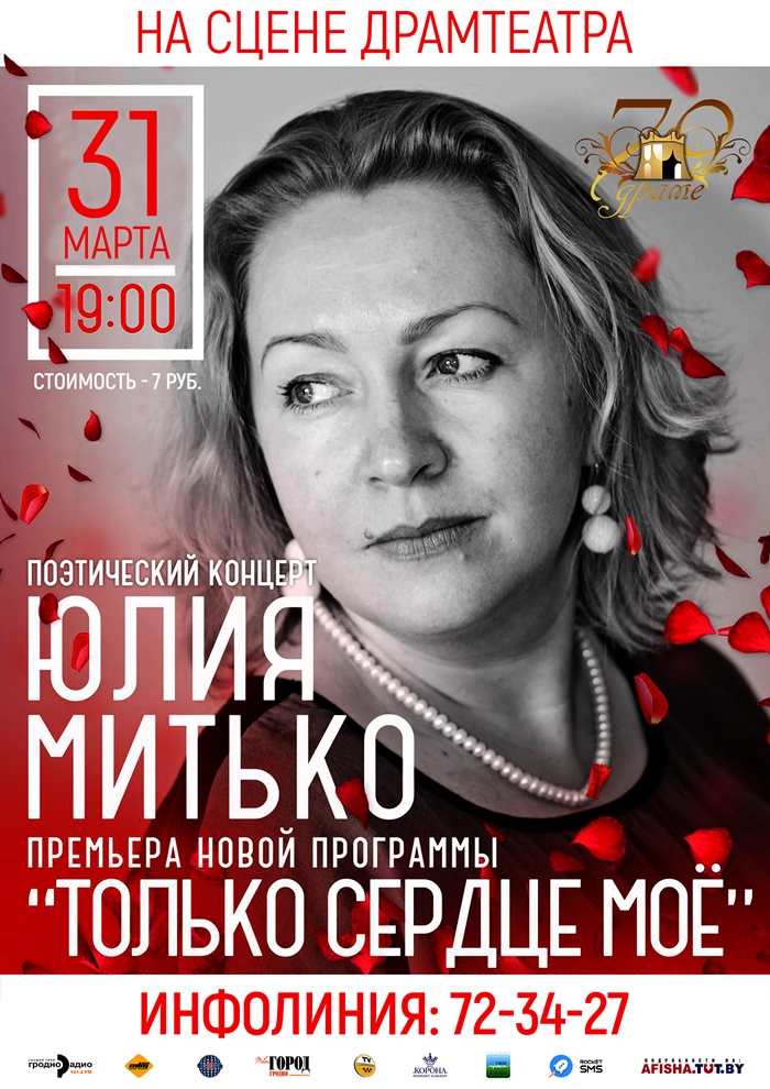 В марте в Гродненском областном драматическом театре состоится поэтический концерт Юлии Митько. Ее имя на слуху и многим знакомо, благодаря родному брату, музыканту Илье Митько, который долгие годы держит музыкальный олимп современной поп-культуры страны.