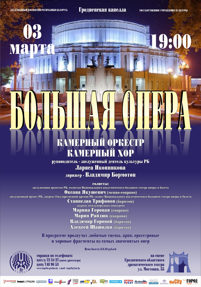 В программе «Большая опера» принимают участие камерный оркестр и хор, солисты капеллы Марина Горовая, Мария Райдюк, Владимир Горовой, Алексей Шашолко, а также наши гости заслуженный артист РБ, лауреат Государственной премии Станислав Трифонов, заслуженная артистка РБ Оксана Якушевич.