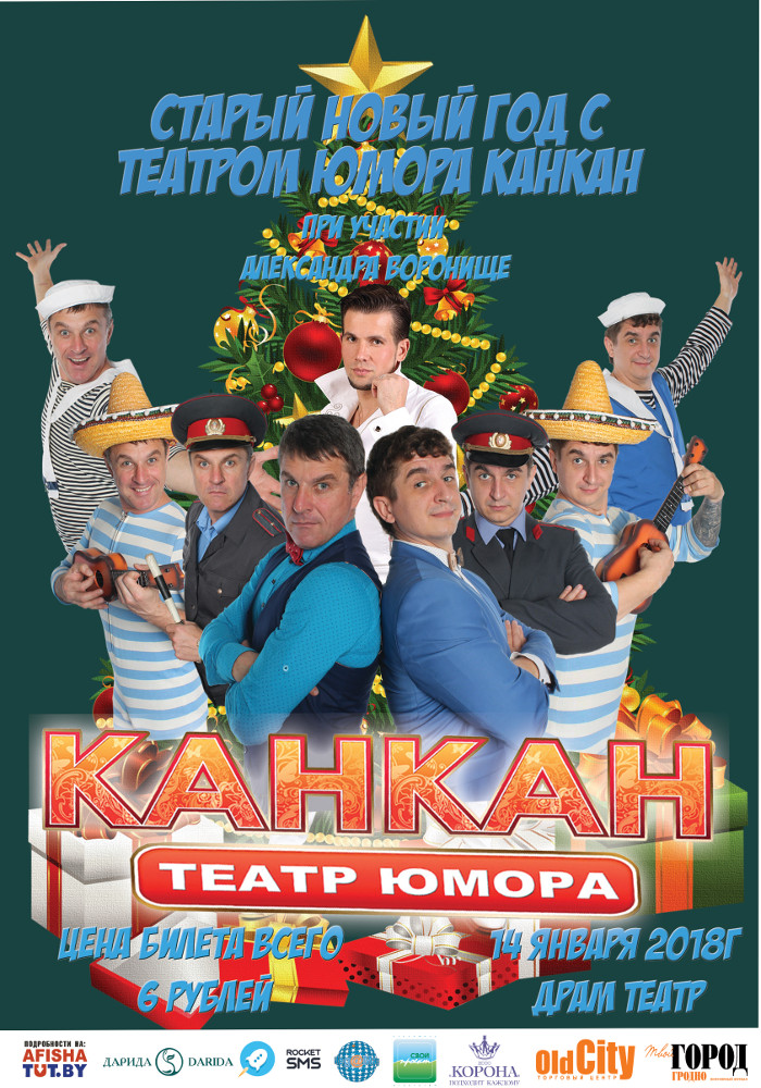 Дорогие друзья, театр юмора Канкан совместно с гродненским драматическим театром, приготовил своим любимым зрителям ПОДАРОК к Старому Новому Году. 14 января на сцене театра состоится 14-й концерт посвященный этому замечательному празднику, вас ждёт много сюрпризов и хорошего настроения!) А первый сюрприз это цена на билеты - всего 6 рублей!) Ждём вас!)