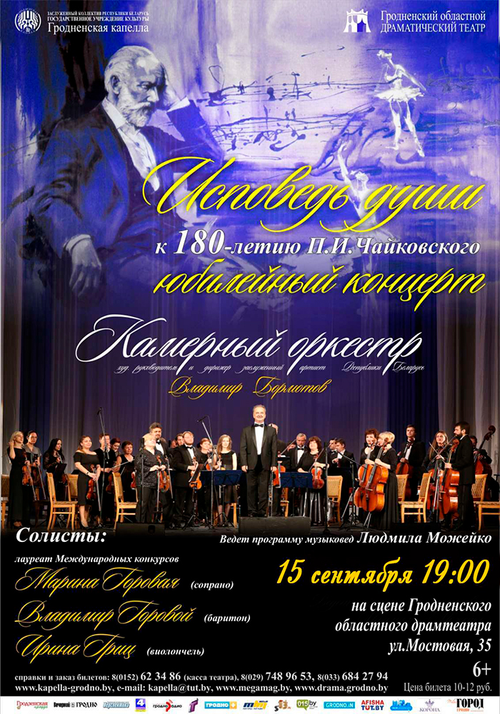 Камерный оркестр заслуженного коллектива Республики Беларусь «Гродненская капелла» представляет программу «Исповедь души», которая проходит в рамках празднования 30-летнего юбилея камерного оркестра и 180-летия выдающегося русского композитора П.И.Чайковского. В концерте будут исполнены произведения Чайковского: Сцены из оперы «Евгений Онегин», Интродукция и мазурка из музыки к хронике А.Островского «Дмитрий Самозванец и Василий Шуйский», Ноктюрн для виолончели с оркестром и Симфония в5. Солисты – лауреат Международного конкурса, сопрано Марина Горовая, виолончелистка Ирина Гриц и баритон Владимир Горовой.