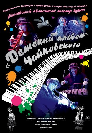 "Детский альбом" Чайковского" - экспериментальный спектакль Ивановского областного театра кукол. Взяв несколько программных произведений Петра Ильича Чайковского, мы попытались "расшифровать" их для себя и для зрителя, создать ряд номеров, используя различные театральные приемы и техники - от планшетных кукол, теневого театра до живого рисования.