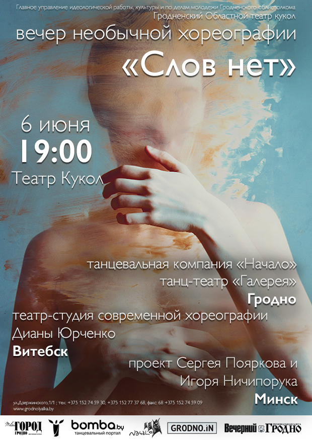 Участники – танцевальная компания «Начало», танец-театр «Галерея» (г.Гродно); Студия Дианы Юрченко (г.Витебск); Проект Сергея Пояркова (г.Минск)