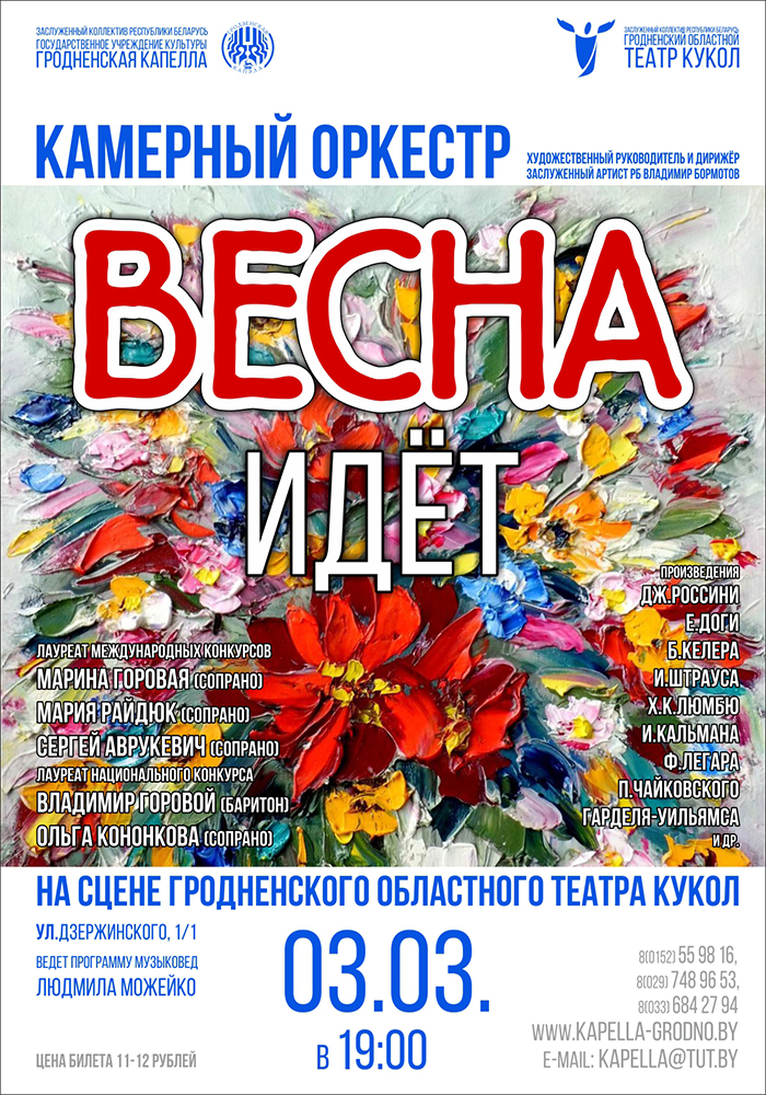 Камерный оркестр заслуженного коллектива Республики Беларусь «Гродненской капеллы» приглашает на большую праздничную программу «Весна идет!». Ярким и незабываемым украшением которой станут произведения Дж.Россини, П.Чайковского, И.Штрауса, Ф.Легара, И.Кальмана, Е.Доги и др.