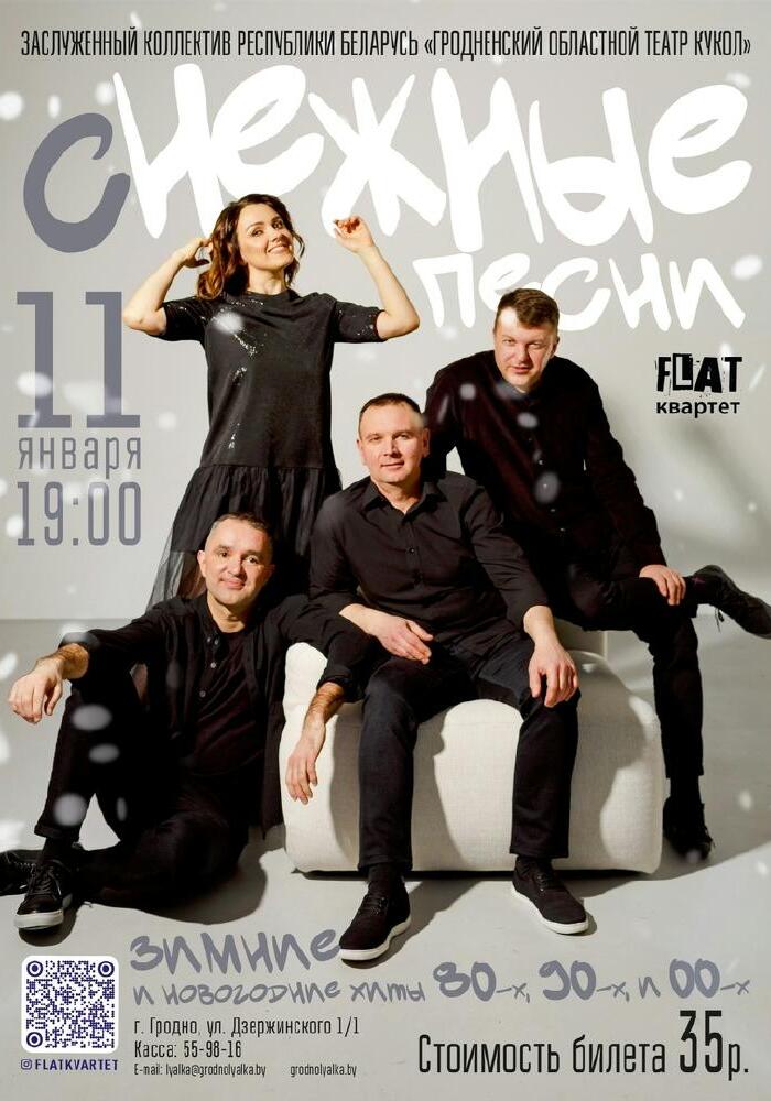 Группа #ФЛЭТКВАРТЕТ исполнит зимние и новогодние хиты 80-х, 90-х и 00-х, песни из любимых фильмов – «Ирония судьбы или с легким паром», «Иван Васильевич меняет профессию», «Служебный роман», «Чародеи», зажигательные шлягеры разных лет из репертуара Кати Лель и Анны Асти, «Жуки» и «Иванушки International», Xolidayboy и других известных артистов и  общение со зрителем.
