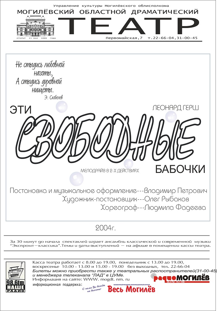 Дружбе, которую объединила любовь к музыке. Музыка - это уникальный связующий эл Малая сцена 19:00 Авантюра – это рискованное и сомнительное дело, предпринятое в надежде на случайный успех. Она может стать как бесцельным похождением, так и главным свершением жизни. Наше авантюрн Извините. Нет расписания на выбранный день для данного объекта Малая сцена 12:00 В. Швембергер