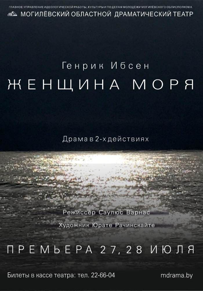 Генрик Ибсен – норвежский поэт и драматург, основатель европейской «новой драмы». «Женщина моря» («Эллида») – одна из самых поэтичных его пьес. На могилёвской сцене она воплощена талантливым творческим тандемом – режиссёром Саулюсом Варнасом и художником-постановщиком Юрате Рачинскайте. Свобода воли и деспотизм любви, пробуждение самосознания и ответственности, обретение истинных нравственных ценностей – обо всём этом пойдет речь в спектакле.