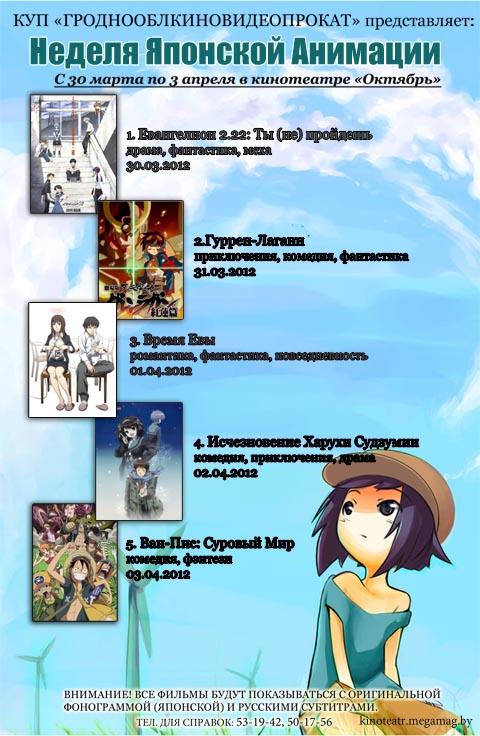 С 30 марта по 03 апреля 2012 года в кинотеатре "Октябрь" (г. Гродно) пройдет Неделя японской анимации.